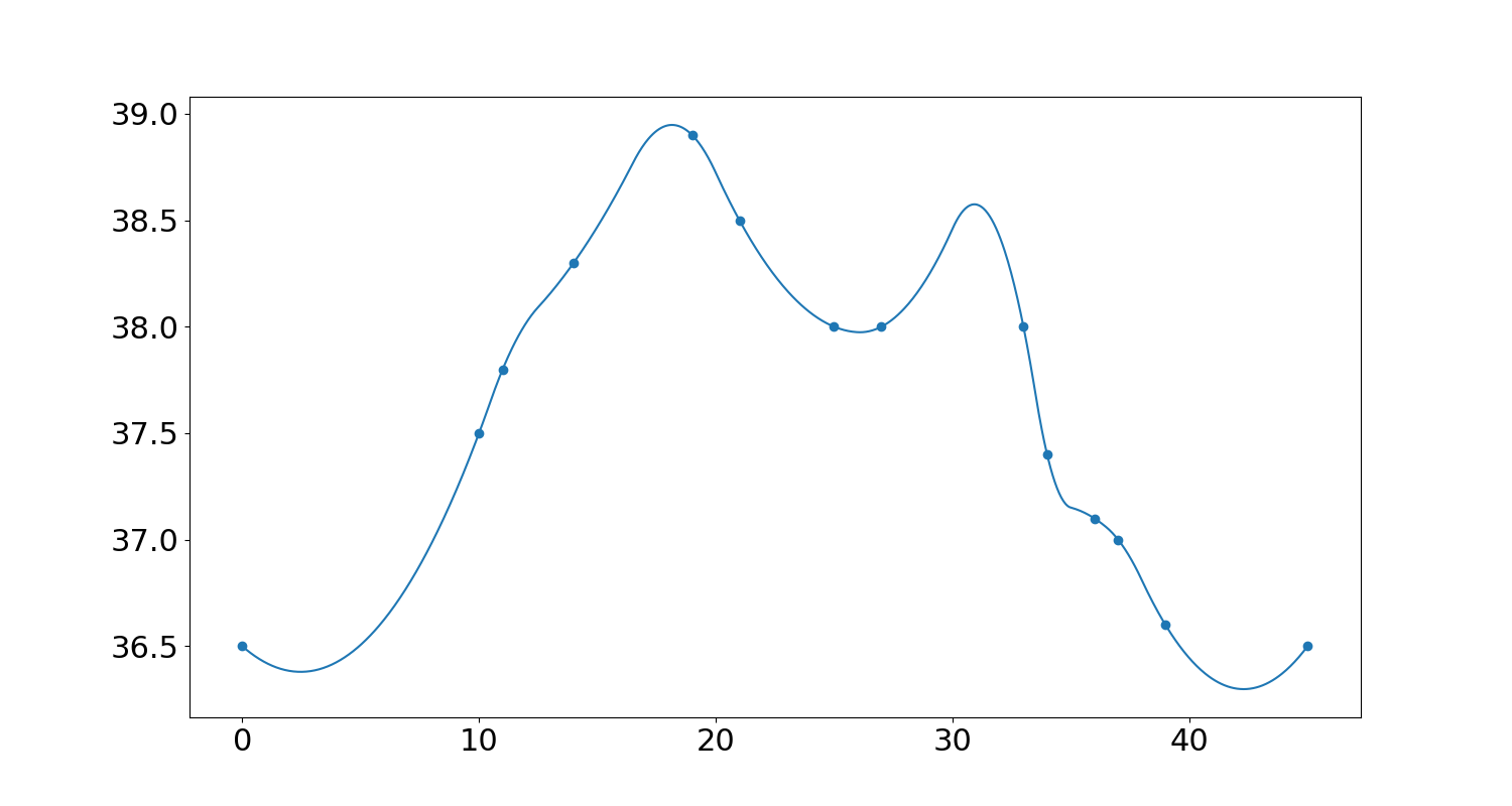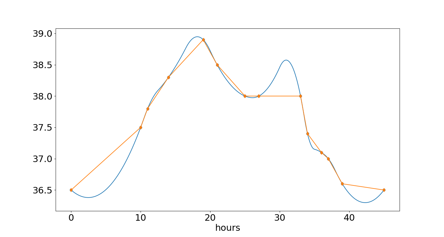 그럼 아래와 같은 그래프가 나온다. 좀 더 smooth 해졌다. 하지만 10시간까지 그리고 30시간 전후를 살펴보면 체온은 올라간 적 없지만 interp1d 기능에서 interpolate를 하는 과정에서 데이터 값의 왜곡이 생긴다. 조심히 사용하자.