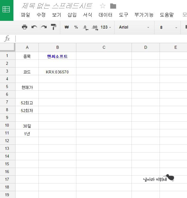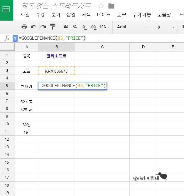 자동으로 B5셀에는 엔씨소프트의 현재가가 표시된다.