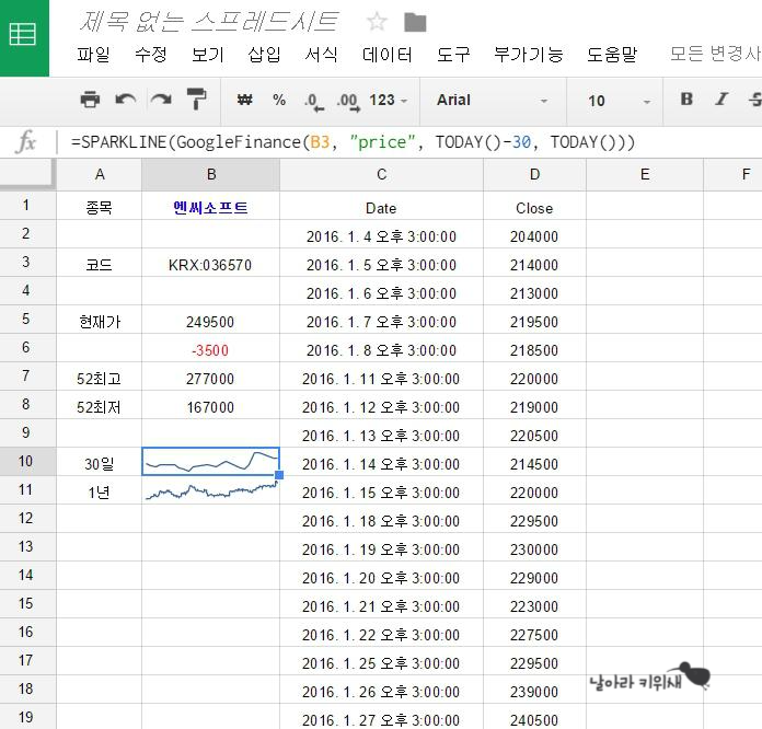 일정기간 동안의 종가 변화를 그래프로 셀안에 표현할 수도 있는데, 구글 스프레드시트의 SPARKLINE 함수를 이용한다. B10셀을 클릭하고 상단 함수 입력란에 =SPARKLINE(GoogleFinance(B3, "price", TODAY()-30, TODAY()))를 입력한다.