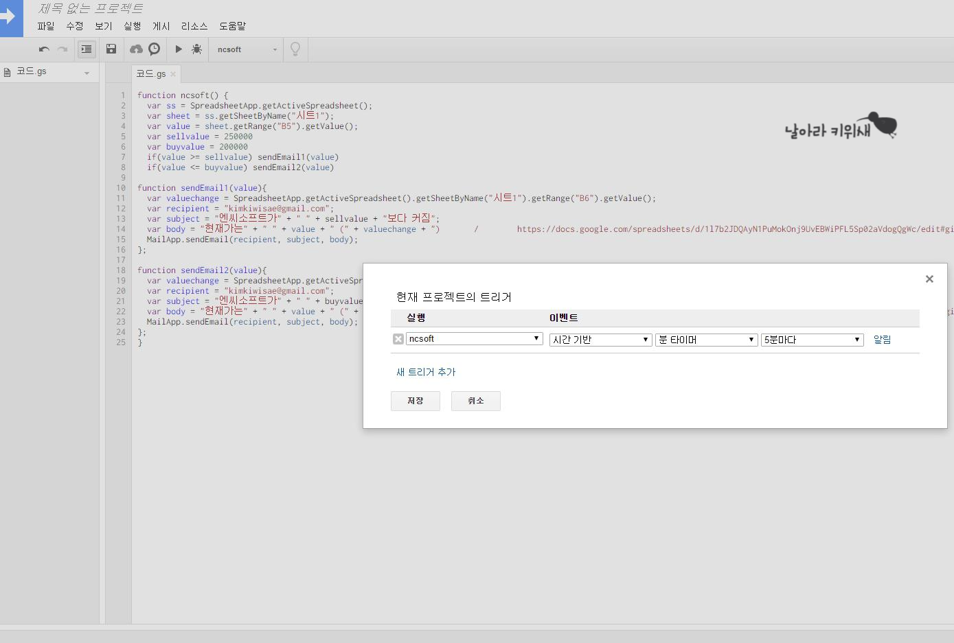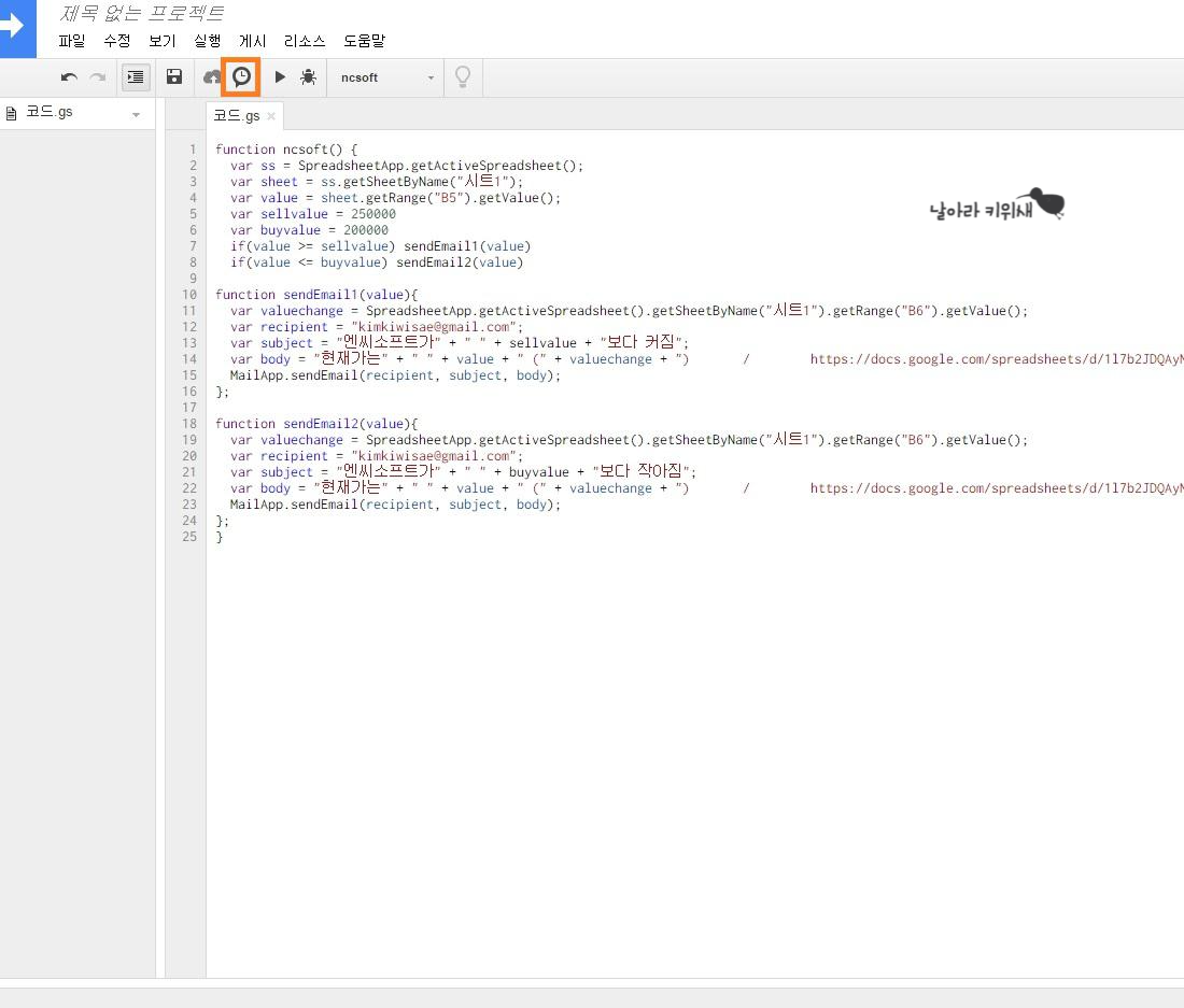 구글 스프레드시트 주식 포트폴리오 관리하기 - 설정편에 이어서 정해놓은 목표가에 현재 주가*가 도달하면 자동으로 이메일을 보내주는 방법을 알아보겠다.