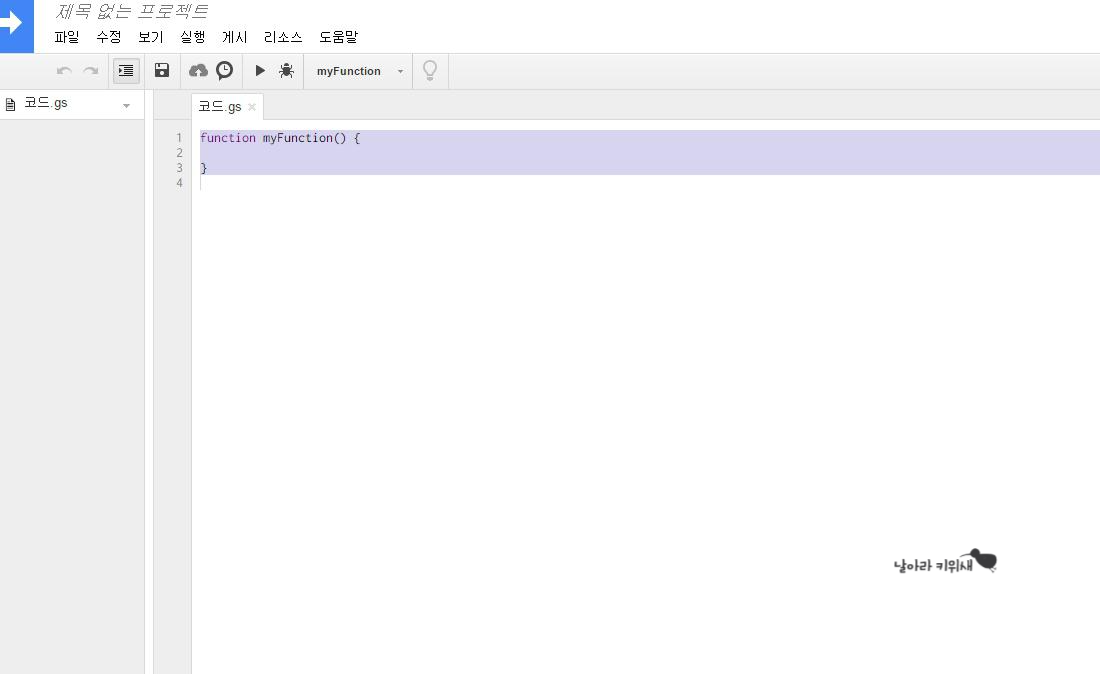 새 창이 뜨며 코드.gs 가 자동으로 생성된다.