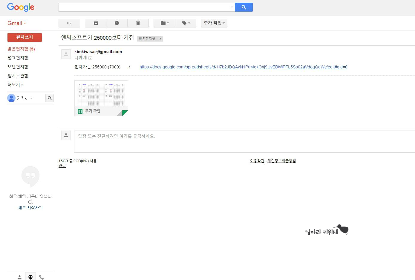 엔씨소프트가 250000보다 커짐이라는 제목의 이메일이 오고