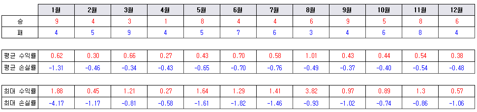 하지만 역시 8월, 9월처럼 승이 많은 경우에는 높은 확률로 수익이 난 달이라고 볼 수 있다.